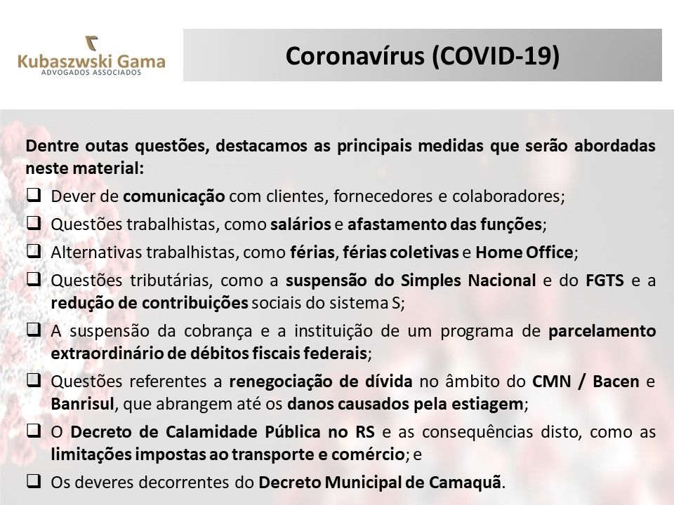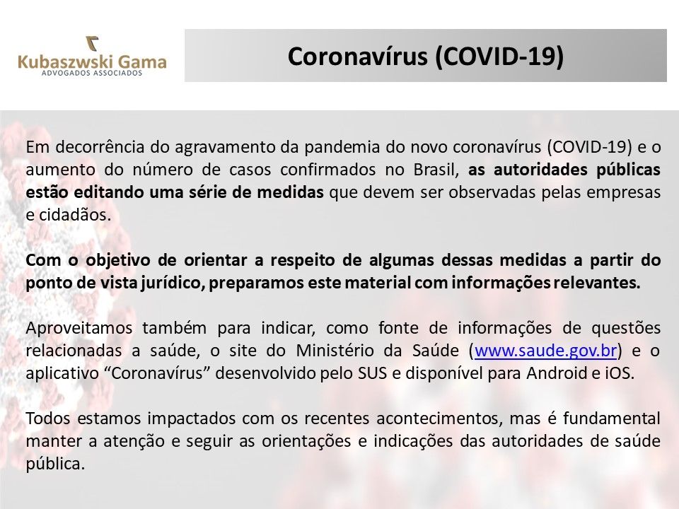 Confira, nas imagens abaixo, os impactos jurídicos das principais medidas adotadas pelas autoridades públicas (Federal, Estadual e Municipal) em razão do atual estado de pandemia e saiba o que você precisa fazer para se adequar.